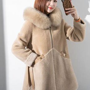 颗粒羊剪绒大衣女中长款连帽复合皮毛一体羊毛狐狸毛皮...