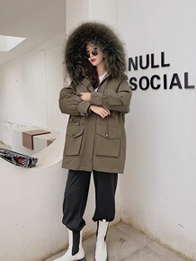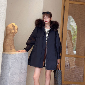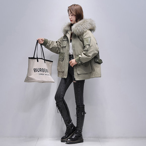 女装2021冬新款可拆卸派克服女款貉子毛领工装设计...