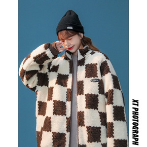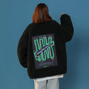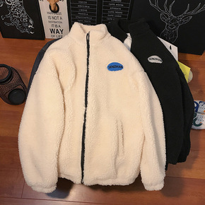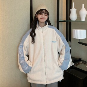 秋冬韩版2021新款仿羊羔毛加厚宽松撞色两穿棒球服...