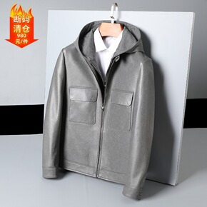 2021春秋新款灰色连帽可拆假两件绵羊皮海宁真皮皮...