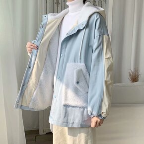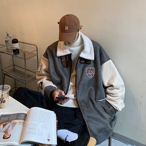 冬季男装棉服韩版潮牌大码羊羔毛拼接撞色宽松休闲加厚...