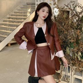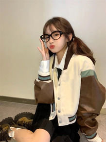 美式复古拼接pu棒球服外套女秋季新款甜酷宽松夹克上...