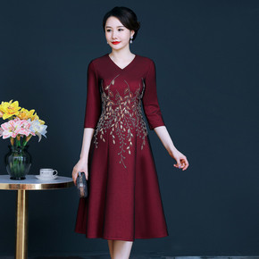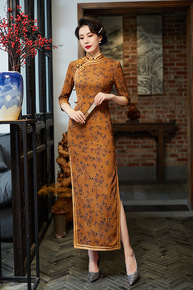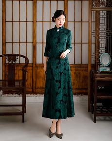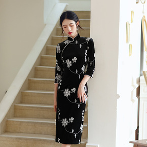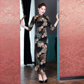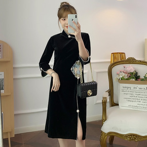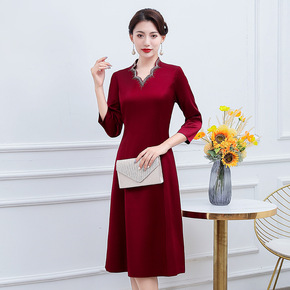 2021秋季新款大摆裙旗袍改良修身中国风长款中袖妈...