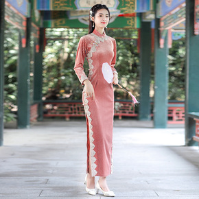 雪尼尔纯色长款七分袖旗袍2021秋冬新款时尚改良老...