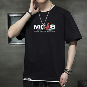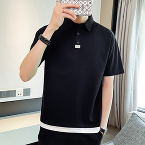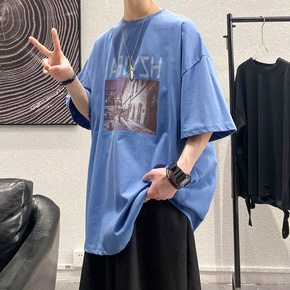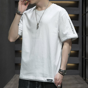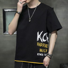 2022新款夏季假两件t恤男短袖简约宽松百搭透气休...