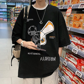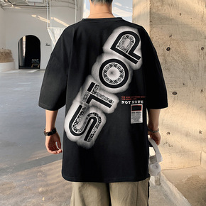 潮牌港风宽松短袖t恤男士夏季新款五分袖休闲潮流纯棉...