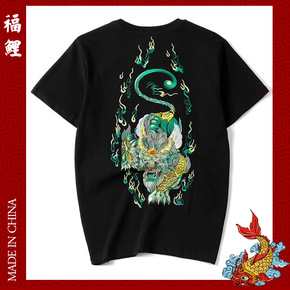 中国风重工刺绣锦鲤图案国潮宽松印花纯棉新款半袖衣服...