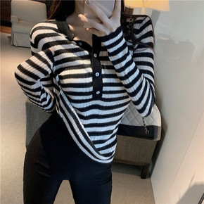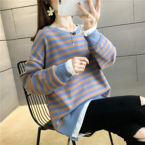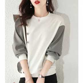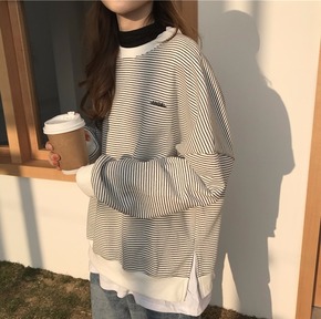 纯棉假两件条纹卫衣2020春秋季新款长袖T恤大码女...