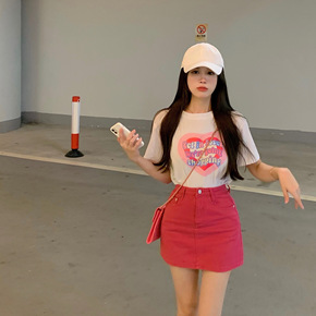 实拍实价!时尚超火2022爱心印花t+玫红包臀牛仔...
