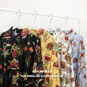 韩国ulzzang夏威夷长袖花衬衫男港风复古防晒外...