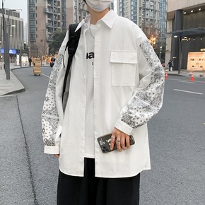 港风ulzzang腰果拼接衬衫男潮牌设计感宽松炸街...