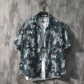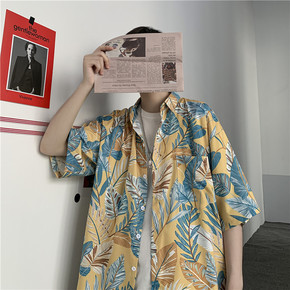 港风复古ulzzang短袖花衬衫男原宿风宽松ins...