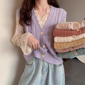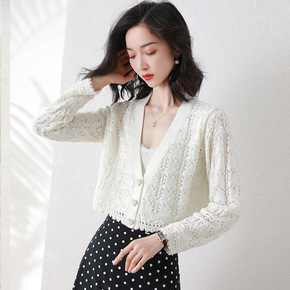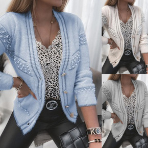 现货 2021欧美爆款外贸针织开衫毛衣针织珍珠蕾丝...