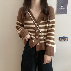 条纹短款针织衫女春秋季网红毛衣开衫外套2021新款...