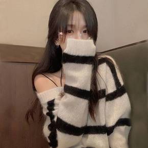 毛衣女秋冬季大码领条纹马海毛针织毛衣女宽松慵懒新款...