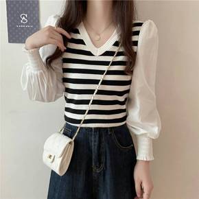 2021年新款泡泡袖撞色条纹拼接T恤上衣女装早秋季...
