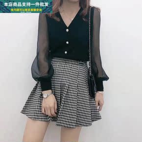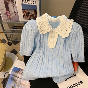 2022新款短款毛衣上衣女洋气小众蕾丝袖雪纺针织打...