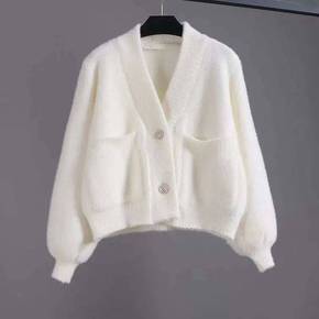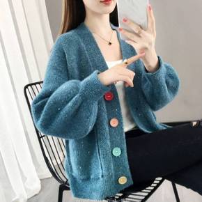 春季新款水貂绒开衫外套女灯笼袖显瘦休闲短款毛衣...