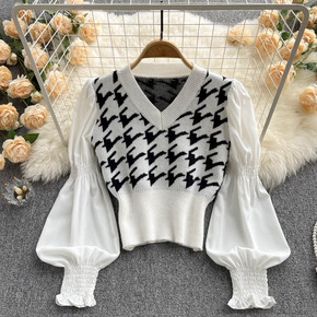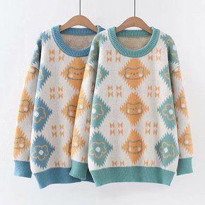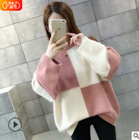 秋冬新款拼色学生套头毛衣女复古提花针织衫外套宽松圆...