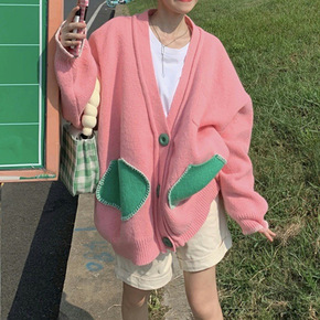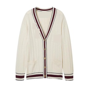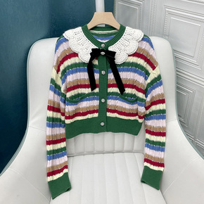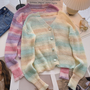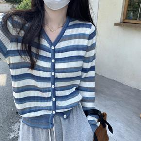 韩版撞色条纹V领针织开衫女2022年秋季新款小众气...