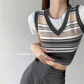 欧美学院风复古条纹针织背心女外穿V领无袖马甲叠穿短...