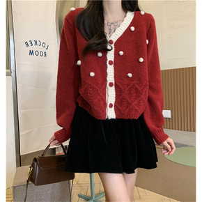 are 红色V领针织马甲女短款2022秋复古学院风...