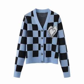 预售2022秋季新款时尚明星同款棋盘格爱心针织衫女...