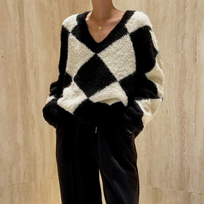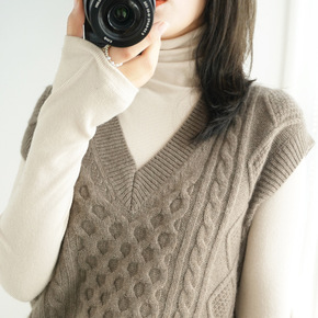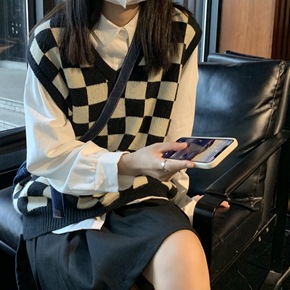 一沫制衣/棋盘格子毛衣背心女V领套头马甲坎肩休闲上...
