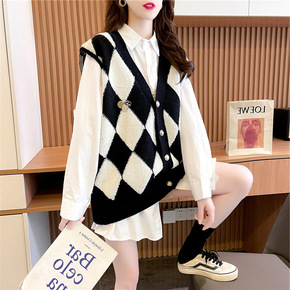 小清新撞色加厚针织马甲女慵懒风格子打底衫2021秋...