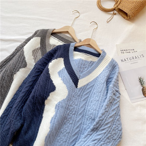 2021秋冬新款复古慵懒风宽松加厚显瘦撞色外搭针织...