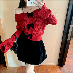 日系慵懒风V领红色毛衣女秋冬季新款宽松外穿内搭套头...