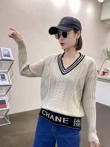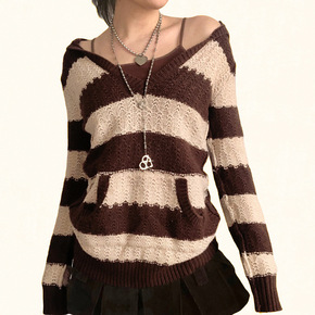 2021女秋街头风气质V领连帽套头棕色毛织上衣撞色...