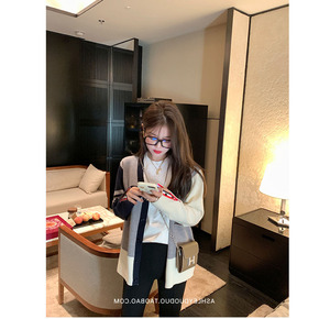 2021秋季新款短款修身貂绒撞色小香风早秋长袖V领...