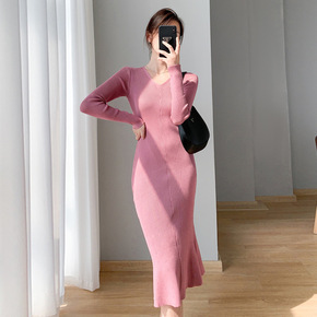2021年秋冬新款中长款过膝毛衣裙子修身显瘦鱼尾内...