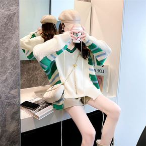 毛衣女2021秋季新款女装学院条纹撞色拼接上衣宽松...
