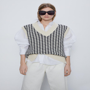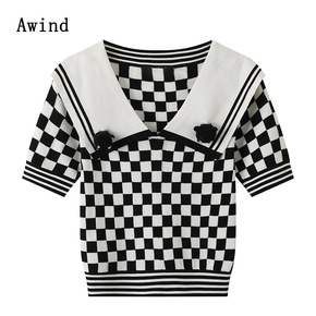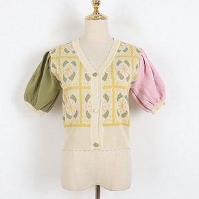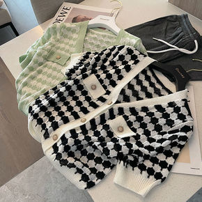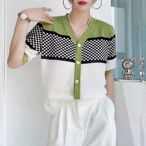 好看亚麻棋盘格拼色V领短袖薄款针织开衫女2022春...