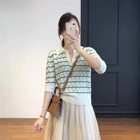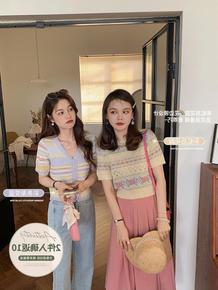 法单S家 法式2022夏季清新撞色风条纹镂空针织...